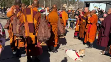 "This morning, Day 73 - 1/6/2026, Aloka started the walk with total focus. Walking right alongside the venerable monks, he was calm, alert, and ready for the journey ahead. It's a beautiful sight to see them all moving together in such harmony! May you and all beings be well, happy and at peace.'