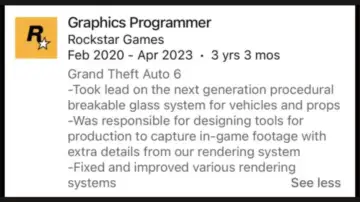 The leak, which surfaced from a LinkedIn profile, revealed that a graphics programmer who worked at Rockstar between 2020 and 2023 spent their time building a "next generation procedural breakable glass system for vehicles and props."
