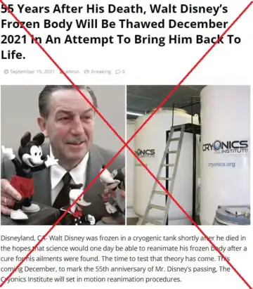 "55 Years After His Death, Walt Disney's Frozen Body Will Be Thawed December 2021 In An Attempt To Bring Him Back To Life," says a September 15, 2021 article from the website Daily News Reported.