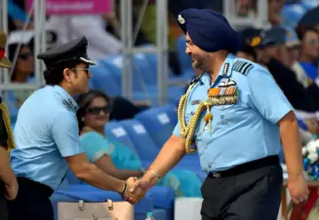 Captain of IAF, Sachin Tendulkar (L) being greeted by Air Chief Marshal BS Dhanoa during the 85th Air Force Day parade at Hindon Air Force base in Ghaziabad on Oct 8, 2017.