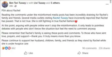 Following the social media buzz over her death news, one of the family members has now clarified that she is still alive. Taking to a Facebook post, Ben Tori Tussey stated, "Reading the comments under the misinformed media posts has been incredibly draining for Rachel's family and friends. Several media outlets stating Rachel Tussey has incorrectly reported that Rachel has passed. That is not true. She is still fighting in true Rachel fashion."