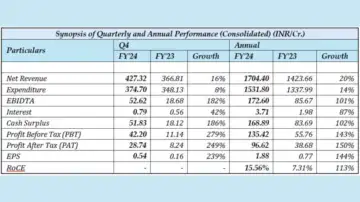 Profit After Tax (PAT): The PAT for Q4'FY24 stood at INR. 28.74 crores, showing a 249% growth compared to INR. 8.24 crores in the same period last year. On an annual basis, PAT increased by 150% to INR. 96.62 crores from INR. 38.68 crores in FY23.