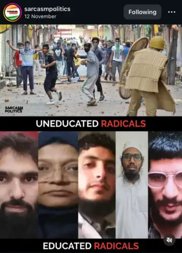 The target of the memes that proliferated on Instagram after the Red Fort blast largely fell under the platitudes of 'Educated vs Uneducated Muslims', 'Terrorism has religion', and 'Muslim Doctors as terrorists'. Paltupatan and politoons, thejaipurdialogues, and total. Wokes are some of the popular right-wing accounts that usually post explicitly hateful content. Another case of Islamophobic memes that appeared in my feed was a set of collaborative reels posted by profiles with usernames Yogesh Thakur and Mannu Kaushik, who have 19k and 50k followers, respectively. Most of the stereotypes that are commonly associated with Indian Muslims, terrorism, madrasa, polygamy, support for external terrorist groups, lack of patriotism, fake voter ID, migrants, incest, etc., were entirely covered using a role-playing approach in a sarcastic tone, in which one person plays the role of a Muslim in a typical attire of white kurta, skull cap, and long beard, while another plays the role of a passive, normal, innocent Hindu Indian. Another account that caught my attention was a profile with the username Manoj Kureel, which posts cartoons covering the entire cosmos of Islamophobic stereotypical narratives. Apart from the Muslim community, liberals, feminists, Bengali migrants, Rahul Gandhi, and Congress are also focal points of such memes. The comment sections of most of these accounts resembled a marketplace of hate-mongering, where users essentialised and reinforced what stereotypical tropes of Islamophobic jokes sought to signify. While the content of the jokes varied, they continued to adopt the same narrative patterns.