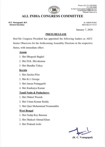 Sudip Roy Burman, Shakeel Ahmad Khan and Prakash Joshi have been appointed as senior observers for the West Bengal Assembly election by the Congress.