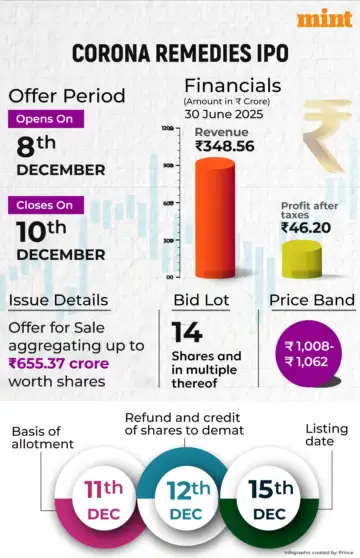 Corona Remedies IPO GMP today is ₹265. Considering the upper end of the IPO price band and the current premium in the grey market, the estimated listing price of Corona Remedies share price is indicated at ₹1,327 apiece, which is 24.95% higher than the IPO price of ₹1,062.