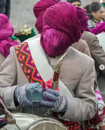 Raulane, the "bride", is dressed in traditional Kinnauri women's clothes: a doru (shawl), a choli, and a pattu (a waist shawl). She also wears a gachchi, a belt-like cloth wrapped around her waist. Her headgear is elaborate. It's decorated with local flowers and colourful cotton seeds (Bakhri Kan).