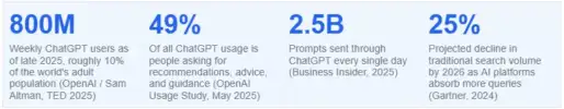 Sources referenced: OpenAI Usage Study (May 2025), Sam Altman TED Talk (2025), Business Insider ChatGPT Data (2025), Gartner Search and Discovery Forecast (2024), Arvow AI Visibility Research (2026), OrbitMedia / QuestionPro AI Chatbot Survey (May 2025), Silverback Strategies AI Search Analysis (2025).