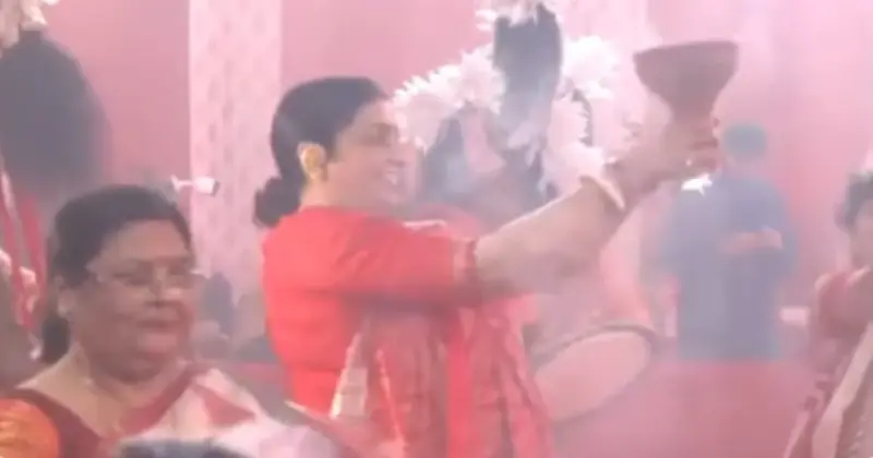 दिल्ली में दुर्गा पूजा के अवसर पर आयोजित भव्य पंडालों में इस बार एक खास दृश्य देखने को मिला। केंद्रीय मंत्री और भाजपा की वरिष्ठ नेता स्मृति ईरानी पारंपरिक बंगाली साड़ी में सज-धजकर दुर्गा पूजा पंडाल पहुंचीं और वहां परंपरागत 'धुनुची नृत्य' करती नजर आईं।