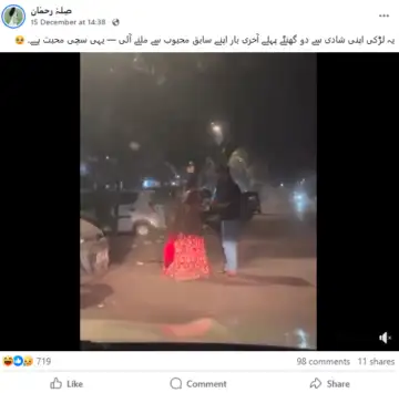 ویڈیو کے ساتھ صارفین نے لکھا ہے “یہ لڑکی اپنی شادی سے دو گھنٹے پہلے آخری بار اپنے سابق محبوب سے ملنے آئی، یہی سچی محبت ہے”۔