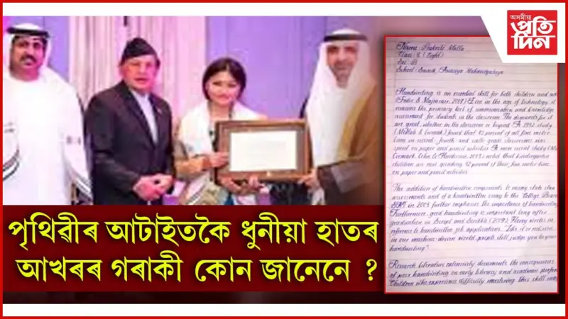 ডিজিটেল ডেস্ক: আজিৰ ডিজিটেল যুগত টাইপিঙৰ প্ৰয়োভৰত ক্ৰমান্বয়ে লোপ পাবলৈ ধৰিছে হাতৰ আখৰ। কিন্তু এই সময়তে আকৌ হাতৰ আখৰে বিশ্বজুৰি প্ৰশংসা লাভ কৰিছে। হয়, শেহতীয়াকৈ এগৰাকী যুৱতীৰ হাতৰ আখৰক 'পৃথিৱীৰ আটাইতকৈ ধুনীয়া হস্তাক্ষৰ' হিচাপে স্বীকৃতি দিয়া হৈছে। পৃথিৱীৰ আটাইতকৈ ধুনীয়া হাতৰ আখৰৰ গৰাকীৰ নাম প্ৰকৃতি মাল্লা। নেপালৰ বাসিন্দা প্ৰকৃতিৰ বয়স ১৬ বছৰ। প্ৰকৃতিৰ হাতৰ আখৰ ইমানেই নিখুঁত আৰু ধুনীয়া যে বিশেষজ্ঞসকলে ইয়াক 'মাষ্টাৰপিচ' আখ্যা দিছে।
