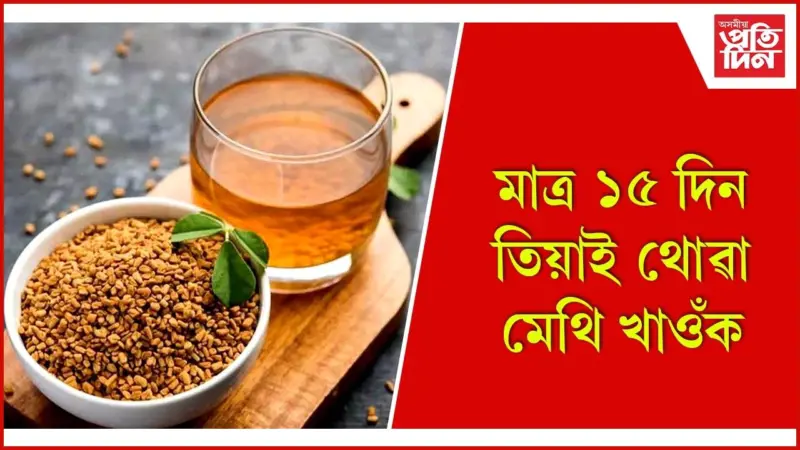এচামুচ মেথি গুটি পানীত ৰাতি তিয়াই থ’ব। ৰাতিপুৱা উঠি মেথি গুটিখিনি খালি পেটত খাব লাগে। একেৰাহে ১৫ দিন খালেই আপুনি বহু স্বাস্থ্য সমস্যাৰ পৰা পৰিত্ৰাণ লাভ কৰিব। তিয়াই থোৱা মেথি গুটি স্বাস্থ্যৰ বাবে অতি উপকাৰী আৰু আয়ুৰ্বেদত ইয়াক প্ৰাকৃতিক ঔষধ বুলি গণ্য কৰা হয়। যদি আপুনিও আপোনাৰ স্বাস্থ্য উন্নত কৰিব বিচাৰে, তেন্তে মেথি গুটি খোৱাটো আপোনাৰ দৈনন্দিন খাদ্য তালিকাত অন্তৰ্ভুক্ত কৰিব পাৰে।