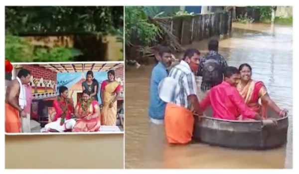 গত চারদিন লাগাতার বৃষ্টিতে ভেসে গেছে কেরালার গ্রাম, শহরের অনেক বাড়িঘর। বন্যা-ভূমিধসে প্রাণ হারান দুই ডজনের বেশি মানুষ। রাস্তাঘাট তলিয়ে গেছে জলের নিচে। কিন্তু কীভাবে সেখানে বিয়ের মতো বড় অনুষ্ঠান সম্ভব হলো? এ জন্য অভিনব পন্থা বেছে নিয়েছেন কেরালার ওই যুগল। গামলায় চড়ে বিয়ে করতে গেলেন তারা।