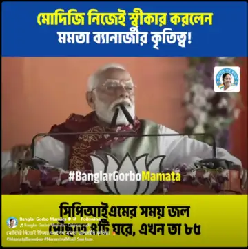 সোশ্যাল মিডিয়ায় ভাইরাল ভিডিয়োতে প্রধানমন্ত্রী নরেন্দ্র মোদীকে মঞ্চ থেকে বলতে শোনা যাচ্ছে, "যখন বামেদের সরকার ছিল, তখন ১০০ মধ্যে মাত্র ৪টি বাড়িতে নলবাহিত জল যেত। আজ ৮৫টি বাড়িতে জল যায়"। ভিডিয়োটি ফেসবুকে পোস্ট করে দাবি করা হয়েছে যে, প্রধানমন্ত্রী নরেন্দ্র মোদী, মমতা বন্দ্যোপাধ্যায়ের নেতৃত্বাধীন এ রাজ্যের তৃণমূল সরকারের কৃতিত্ব স্বীকার করেছেন।