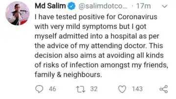 - দ্য ওয়াল ব্যুরো: গত কাল, রবিবার দুপুরে স্বস্তির মিলেছিল বাম শিবিরে। সুস্থ হয়ে হাসপাতাল থেকে বাড়ি ফিরেছিলেন চিকিত্সক নেতা ফুয়াদ হালিম। কিন্তু রাতেই শোনা যায় বর্ষীয়ান সিপিএম নেতা শ্যামল চক্রবর্তীকে ভেন্টিলেটর সাপোর্টে রাখতে হয়েছে। সোমবার সন্ধ্যায় জানা গেল সিপিএম পলিটব্যুরোর সদস্য মহম্মদ সেলিমও করোনা আক্রান্ত হয়েছেন। কোভিডে আক্রান্ত হওয়ার কথা নিজেই টুইট করে জানিয়েছেন সেলিম। তিনি জানিয়েছেন, তাঁর মৃদু উপসর্গ রয়েছে। চিকিত্সদের পরামর্শ মেনে তিনি হাসপাতালে ভর্তি হচ্ছেন।