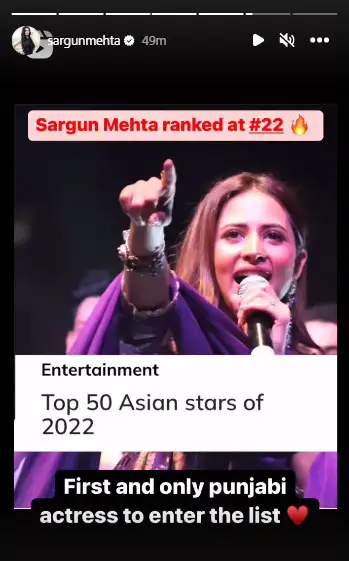 A couple of days ago, slain Punjabi singer Sidhu Moose Wala has grabbed 3rd position but now the news of Sargun Mehta has been catching the limelight. Moreover, the details have been shared by the actress herself through her official Instagram. She shared a picture in which it has been written 'Entertainment- Top 50 Asian Stars of 2022'.