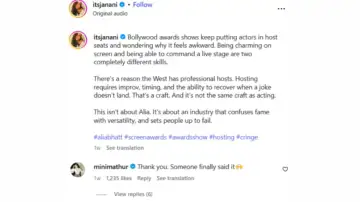 The discussion started after content creator Its Janani shared a clip from the an awards show featuring Alia Bhatt as host. In the post, she argued that Bollywood often gives hosting duties to stars, even though live anchoring demands a very different skill set.