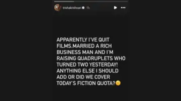 However, Trisha wasted no time in shutting down the chatter. In a witty post, she wrote, 'Apparently I've quit films, married a rich businessman and I'm raising quadruplets who turned two yesterday! Anything else I should add or did we cover today's fiction quota?"