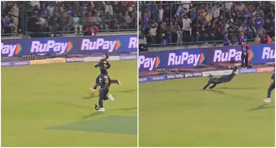 The incident occurred when DC opener KL Rahul attempted to loft a delivery from pacer Ashok Sharma. Rahul didn't get the desired connection, sending a thick bottom edge high into the night sky.