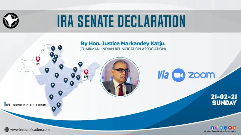 Delhi : Marking as one of the historical events in the history of India, Justice Markandey Katju (Chairman, IRA) officially declared the first IRA senate on 21st February 2021 (Sunday) through a zoom meeting.