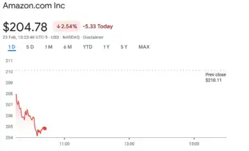 Amazon.com Inc. shares fell 2.54% to $204.78 in morning trading on Feb. 23, down $5.33 from the prior close of $210.11.