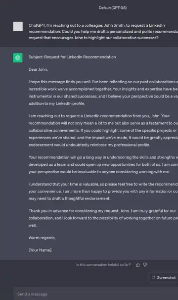 Message Recruiter Prompt: "Draft a polite message to a recruiter on LinkedIn for a [role] at [company]."