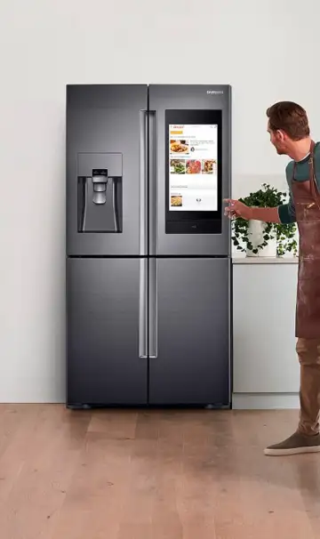 Samsung Family Hub refrigerator features large touchscreen managing groceries, calendars, entertainment, and smart devices.