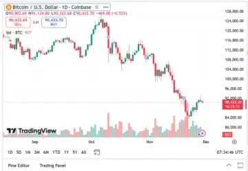 The price of Bitcoin is $90,433.69, a significant drop of 0.74% of its value, with a market cap of $1.8 trillion, and the trading volume is $57.53 billion. Analysts say that volume is still good, but the recent stall near the upper band will keep prices from going up in the near future.