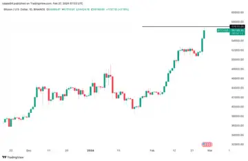 Bitcoin (BTC) price broke out of range on Feb. 27, rising more than 12% to hit a multi-year high at $57,010 on Feb. 27. The last time Bitcoin traded above $57,000 was more than two years ago on Dec. 2, 2021, when the price dropped from an opening of $57,327 before setting a swing low around $15,000 during the extended bear market in 2022.