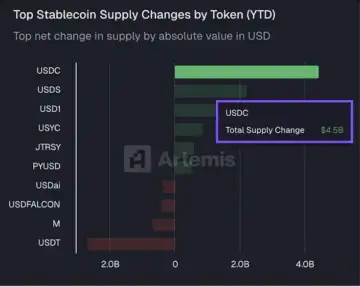 Artemis tracks net supply change by measuring minting against redemptions. By that measure, USDC ranks first among the major stablecoins. Its $4.5 billion increase places it well ahead of all other tokens on the chart.