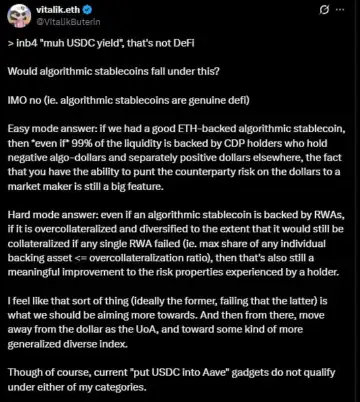 Buterin outlined two frameworks for assessing what qualifies as decentralized finance. The first approach, which he described as the "easy mode," centers on ETH-backed algorithmic stablecoins.
