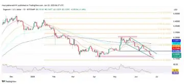 The pattern formed after a significant rejection at $0.246 in May. From a Fibonacci perspective, DOGE is currently hovering between the 0.236 Fib retracement ($0.2018) and the 0.0 level ($0.1299), indicating an oversold condition.