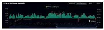 Dogecoin's OI-weighted funding rate has dipped slightly below zero, indicating a brief shift toward short positions. However, over the past two weeks, the rate consistently stayed positive, often above 0.005%, signaling strong bullish sentiment among leveraged traders.