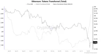 According to the CryptoQuant report by analyst CryptoOnchain, Ethereum's decline coincided with a sharp increase in ERC-20 token movement. The 14-day simple moving average of total tokens transferred jumped from about 1.6 million on January 29 to 2.75 million by February 7.
