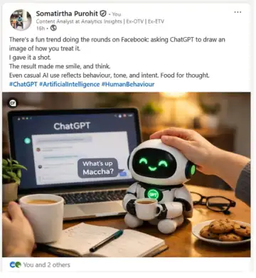 I tried the prompt myself on ChatGPT and shared the result on LinkedIn. "The result made me smile and think. Even casual AI use reflects behaviour, tone, and intent. Food for thought."