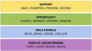 Support terms, opportunity synonyms, male animal names, and liquor brand endings define today's NYT Connections. Watch the clever word fragments.