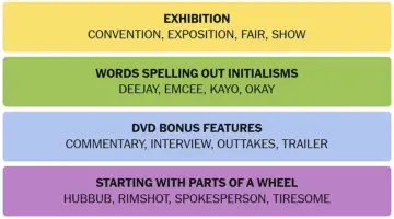 INTERVIEW, OUTTAKES, SHOW, DEEJAY, EMCEE, KAYO, OKAY, CONVENTION, COMMENTARY, SPOKESPERSON, TIRESOME, EXPOSITION, FAIR, TRAILER, HUBBUB, RIMSHOT