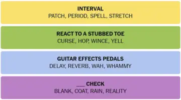 PATCH, WINCE, YELL, DELAY, BLANK, COAT, HOP, REALITY, PERIOD, SPELL, REVERB, WAH, WHAMMY, STRETCH, RAIN, CURSE