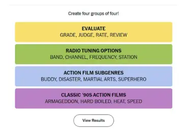 This puzzle emphasizes entertainment topics but maintains a clear framework. The blue group shows a playful variety of movie subgenres, but the purple group's attention-grabbers are iconic '90s titles. The yellow section is the first one for most solvers because of its easy evaluation terms.