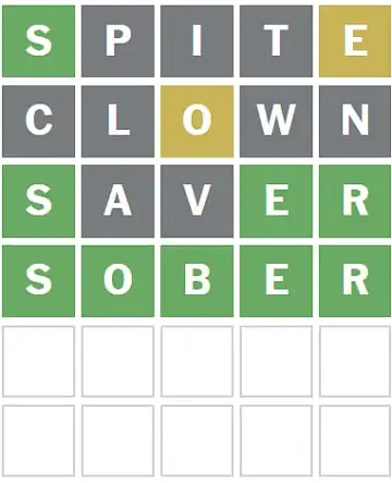 Second Guess: CLOWN - This move is great for testing more vowels and consonants. It reveals that 'O' is part of the word but currently in the wrong position (Yellow). It also eliminates 'C', 'L', 'W', and 'N'.