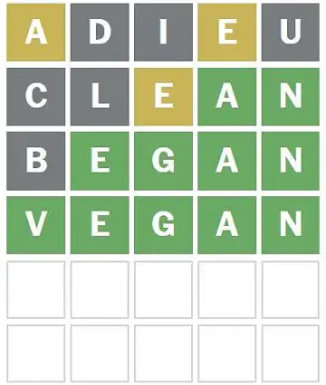 Third Guess: BEGAN With only two slots left, 'BEGAN' seemed like the most statistically likely choice. It used common letters and fit the _ _ _ A N pattern perfectly. To my surprise, the 'B' was gray, but 'E' and 'G' turned green. This left me with a very short list of possibilities.