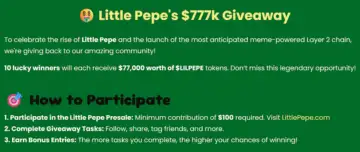 Little Pepe's rise is also being fueled by aggressive community campaigns. A $777,000 giveaway is currently live, offering 10 winners $77,000 worth of LILPEPE tokens each. Entry requires a minimum $100 presale contribution, along with participation in social tasks.