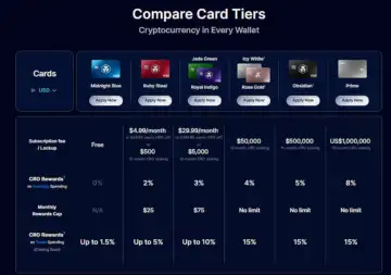 Crypto.com is one of the world's largest crypto brokers and offers one of the most widely used crypto debit cards globally. The Crypto.com Visa Card allows users to spend funds anywhere Visa cards are accepted. Different card tiers are available by staking and locking up the native CRO token for at least six months.