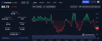 Chainlink plays a crucial role in the blockchain ecosystem by providing decentralized oracle services that connect smart contracts with real-world data. It is currently at $8.73, with a market cap of $6.35 billion and a 24-hour trading volume of $445.76 million, with a fall of 9.23%. The increasing reliance strengthens demand for LINK, positioning it as a key infrastructure asset with long-term growth potential.