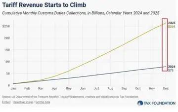 US tariff revenue surged to $264 billion in 2025 after expanded trade duties drove faster monthly collections and higher import costs. New tariffs lifted federal revenue but raised household tax burdens. With retaliation underway, future revenue now depends on import behavior and a pending Supreme Court decision.
