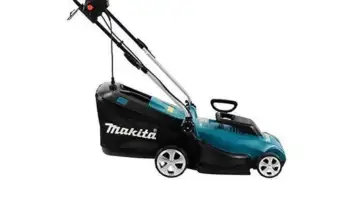 Makita ELM3720 lawn mower features a 370mm cutting width, a 1200 W motor, and a foldable handle for easier mowing and storage.
