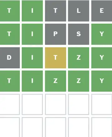 Next play 'DITZY': Now you know T I_ _ Y. With the knowledge that there's a repeated letter and only one vowel (I), the remaining possibilities narrow significantly. Trying 'DITZY' is a smart move to test the 'Z' and confirm its position. Indeed, 'DITZY' reveals 'Z' in its correct fourth position.