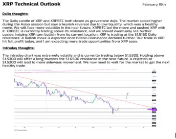 XRP faced renewed volatility on February 15 as Crypto WZRD chart data showed gravestone doji closures on both XRP and XRP/BTC daily candles. The pattern signaled rejection after an Asian-session spike and placed the price near the $1.5160 resistance level. At the same time, the CEO of SBI Holdings clarified the firm's exposure to Ripple, redirecting market attention from rumored XRP holdings to equity ownership in Ripple Labs.