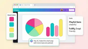 Canva's Magic Charts turns a CSV, or a plain-language prompt such as "pie chart of social traffic share," into an on-brand graphic in seconds. The AI suggests a chart, applies your brand kit, and supports more than twenty chart types, from classic bars and pies to radars and dot-plots.