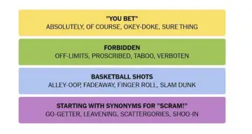 OKEY-DOKE, SCATTERGORIES, SURE THING, ALLEY-OOP, OFF-LIMITS, PROSCRIBED, FADE AWAY, GO-GETTER, LEAVENING, ABSOLUTELY, TABOO, VERBOTEN, OF COURSE, FINGER ROLL, SLAM DUNK, SHOO-IN