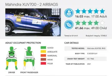The Mahindra XUV700 was tested in the most basic safety specification, fitted with two airbags, ABS brakes and ISOFIX anchorages. GNCAP says the XUV700 could be improved by making standard its optional equipment such as side body airbags, side head curtain airbags, Electronic Stability Control (ESC), and three-point belts in all seating positions.
